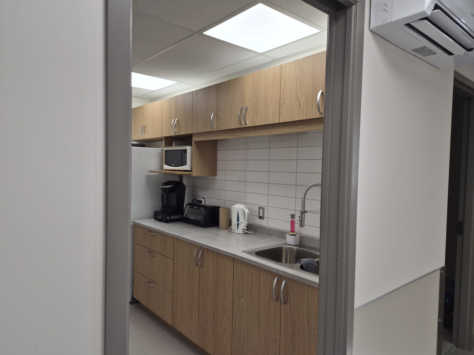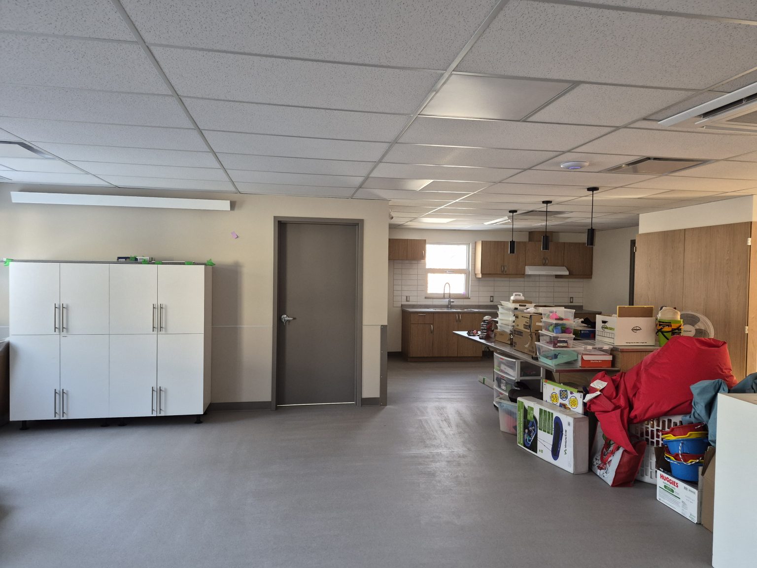 Une grande salle polyvalente avec cuisine, salle de bain adaptée, bureau d’intervention et espace détente.